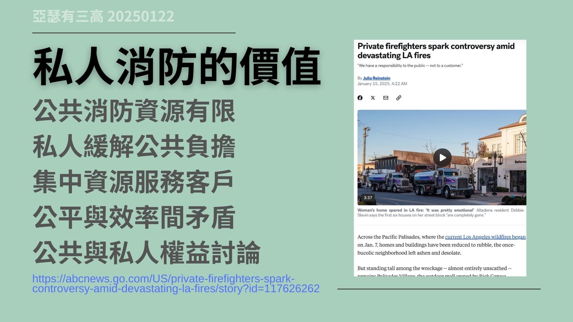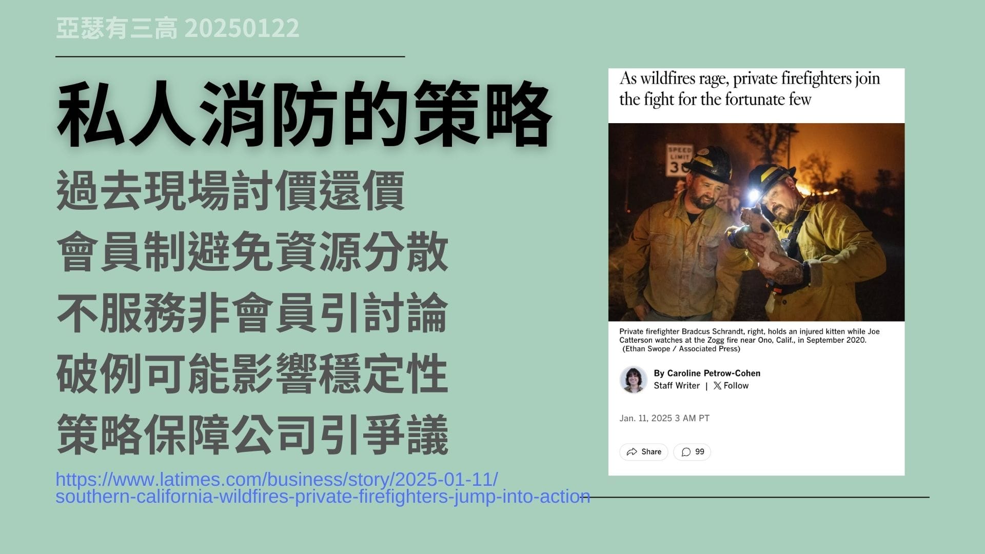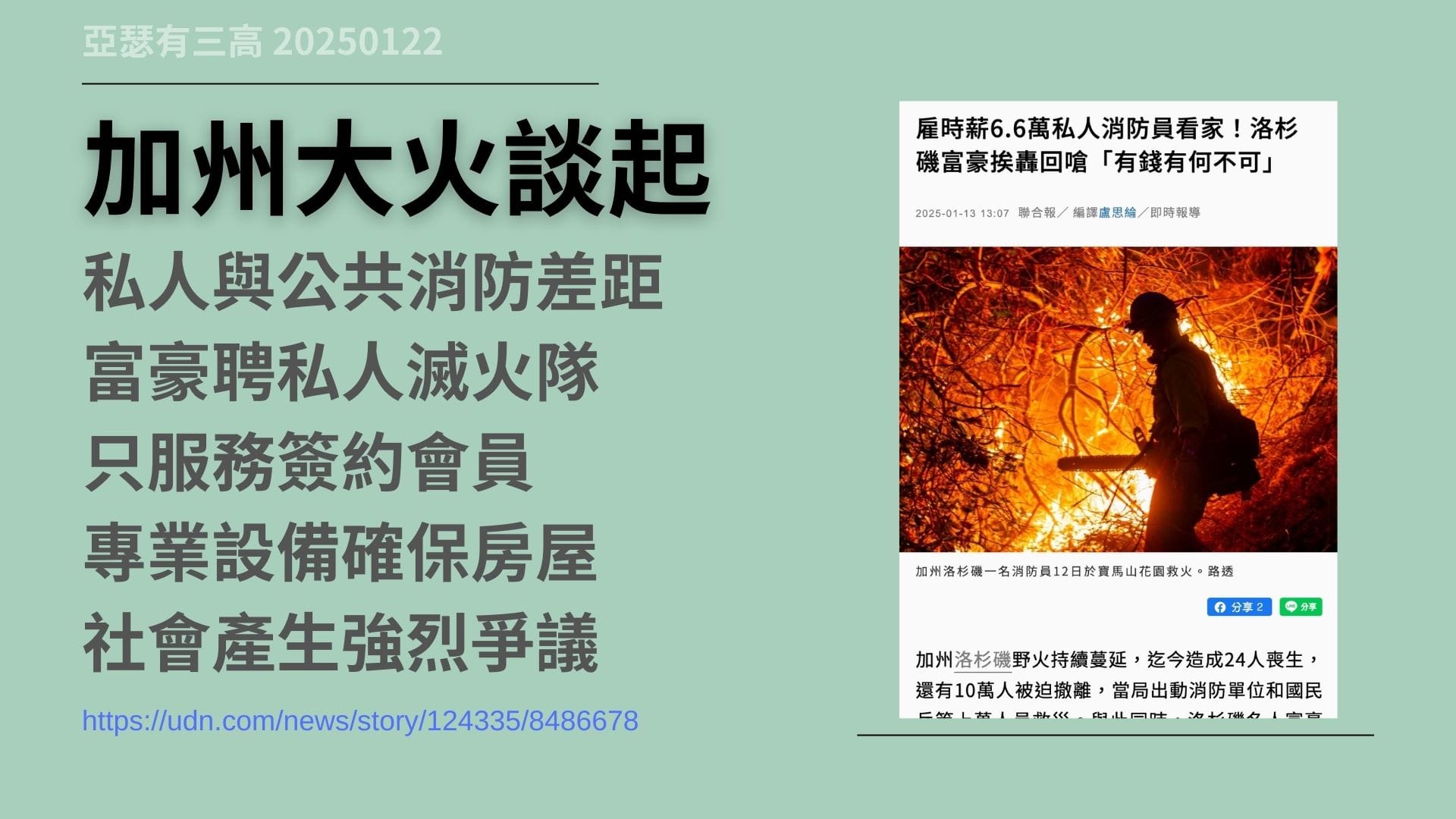 私人滅火隊 加州大火引起爭議 20250122,加州大火揭露了,私人滅火隊與公共消防服務間的矛盾。私人滅火隊以會員制運作,提供專業防火和滅火服務,但高額費用引發公平性爭議。從羅馬時期的私人滅火隊,到現代的公共消防隊,這種矛盾凸顯了,資源分配與社會公平的難題。