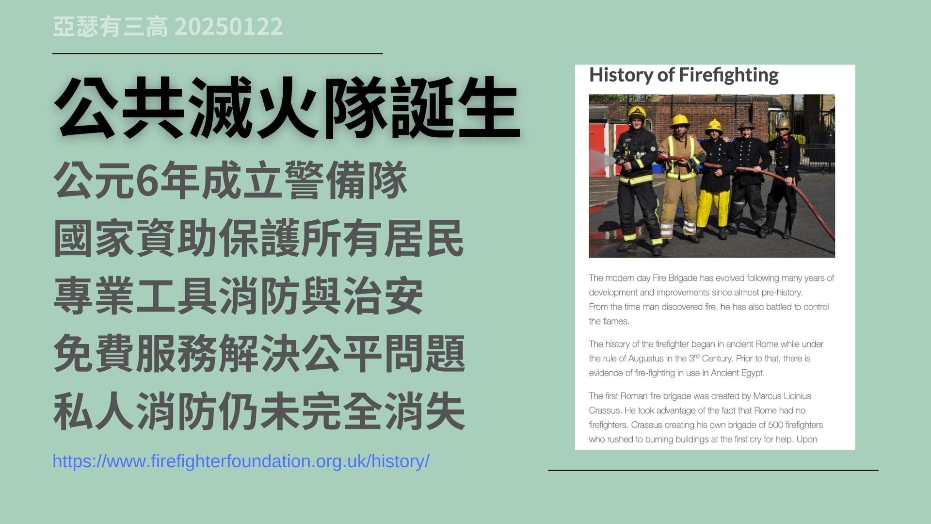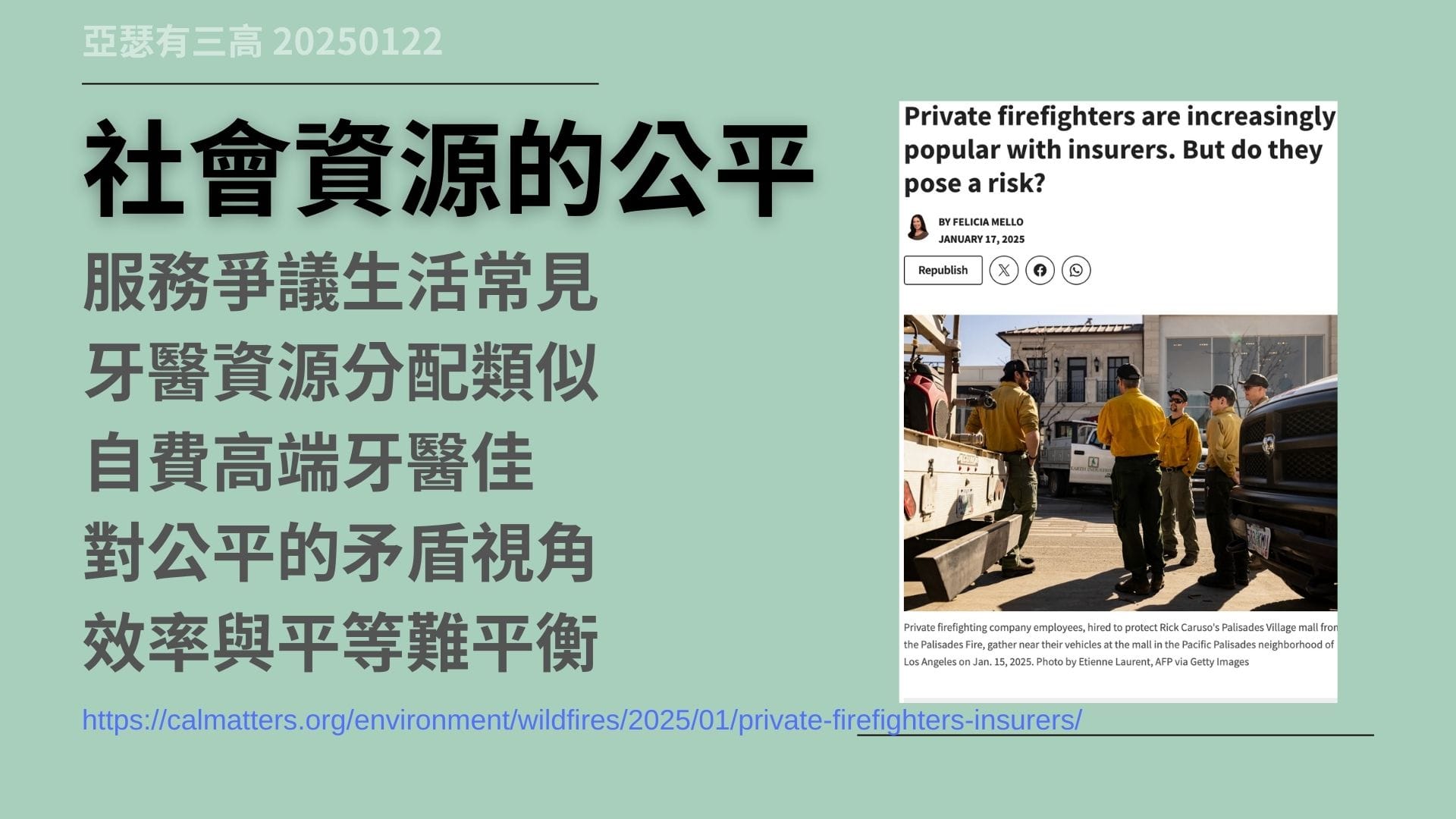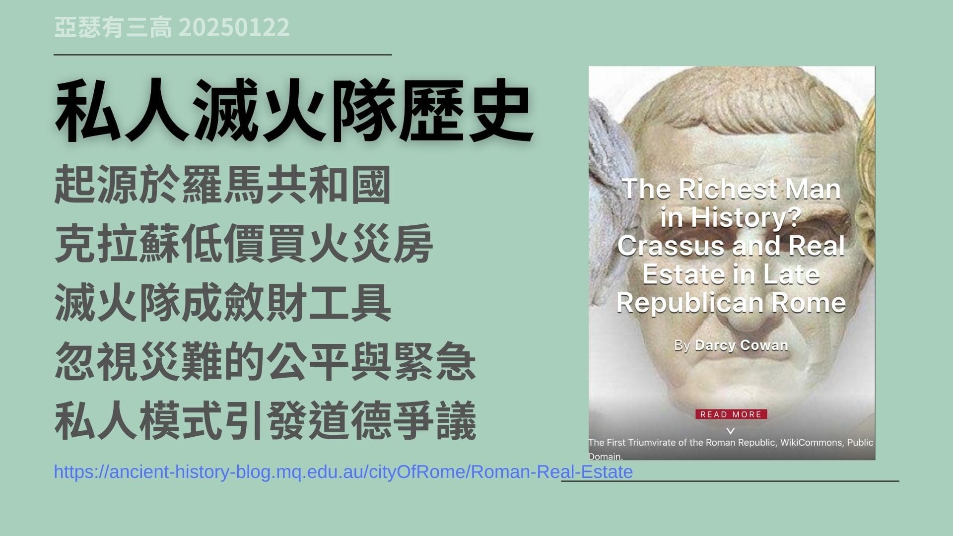 私人滅火隊 加州大火引起爭議 20250122,加州大火揭露了,私人滅火隊與公共消防服務間的矛盾。私人滅火隊以會員制運作,提供專業防火和滅火服務,但高額費用引發公平性爭議。從羅馬時期的私人滅火隊,到現代的公共消防隊,這種矛盾凸顯了,資源分配與社會公平的難題。